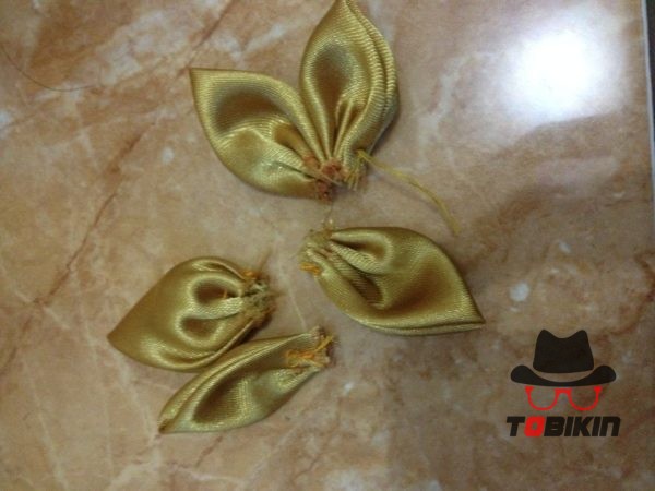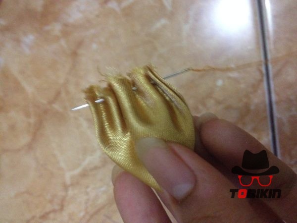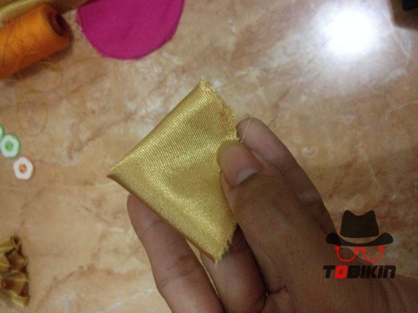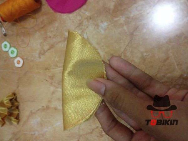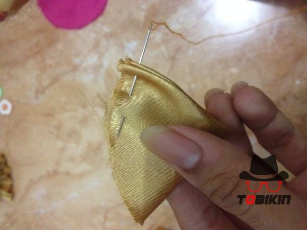3. Kemudian jahit jelujur pinggiran kain perca yang sudah dilipat tersebut, tarik hingga pinggirannya berkerut dan menyerupai kelopak bunga buat sebanyak lima buah. Jangan lupa ikat bagian ujungnya agar tidak mudah lepas.