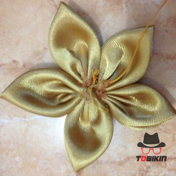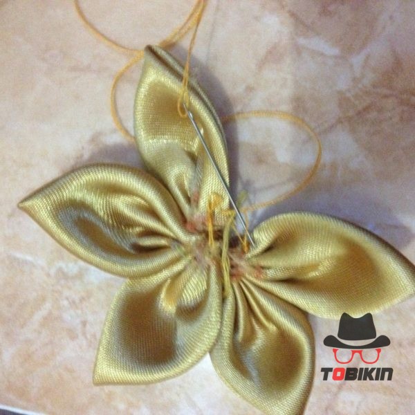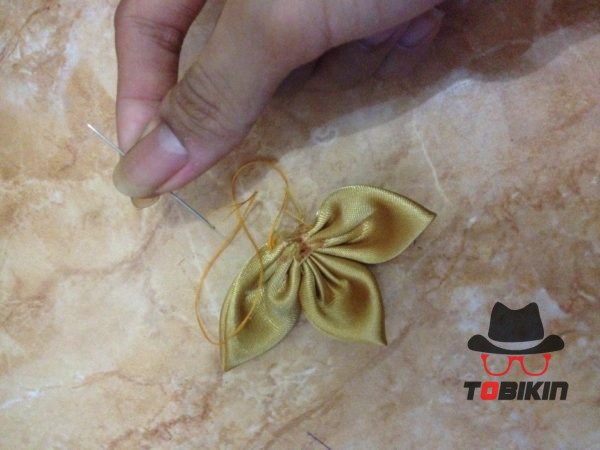 4. Setelah semua kelopak sudah jadi, rangkai kelima kelopak tersebut menjadi satu. Cara merangkainya cukup mudah, masukan saja seluruh kelopak ke dalam benang sehingga membentuk seperti pada gambar.