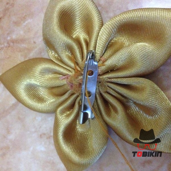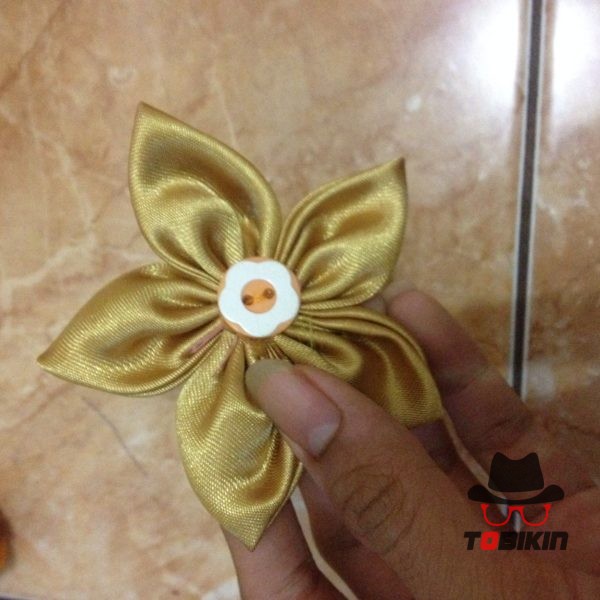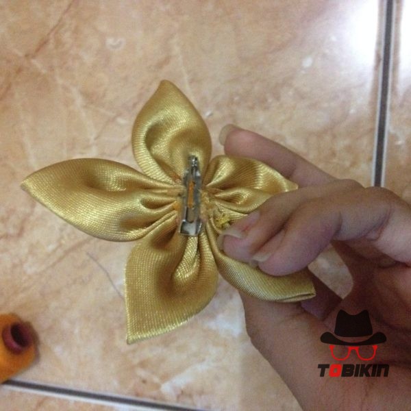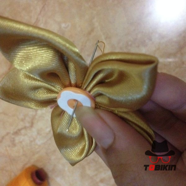 5. Pada satu sisi kelopak yang sudah terbentuk tambahkan kancing cantik sesuai selera sebagai putik bunga. Untuk merekatkannya bisa menggunakan lem maupun dijahit seperti pada tutorial ini. Di sisi lain rekatkan peniti khusus bros dengan cara seperti merekatkan kancing. Jangan lupa usai menjahit, benangnya diikat mati supaya tidak mudah terlepas.