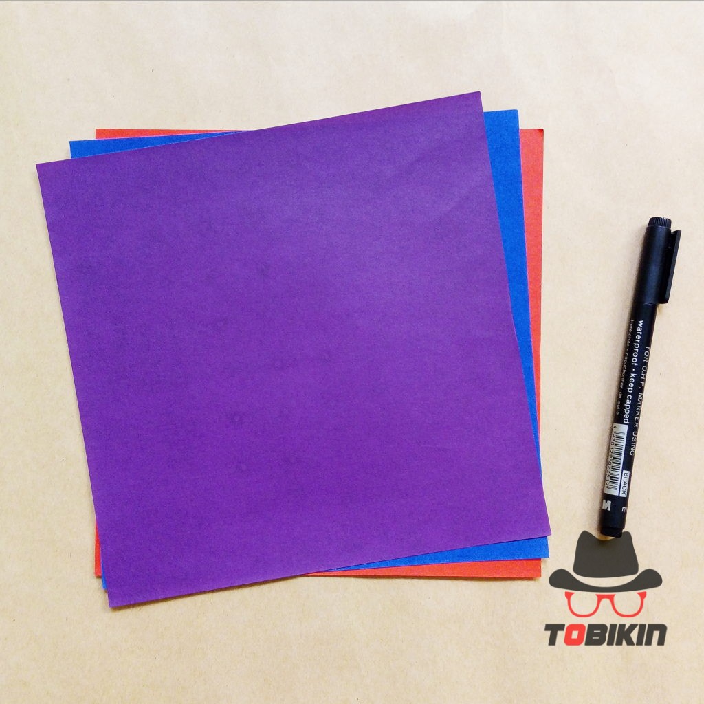 Siapkan kertas lipat persegi berwarna sesuai selera dan spidol warna hitam.