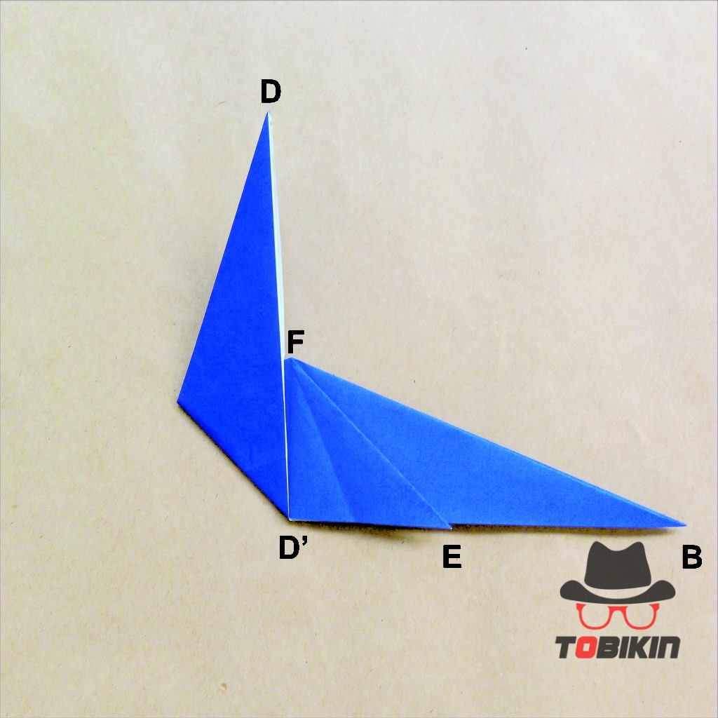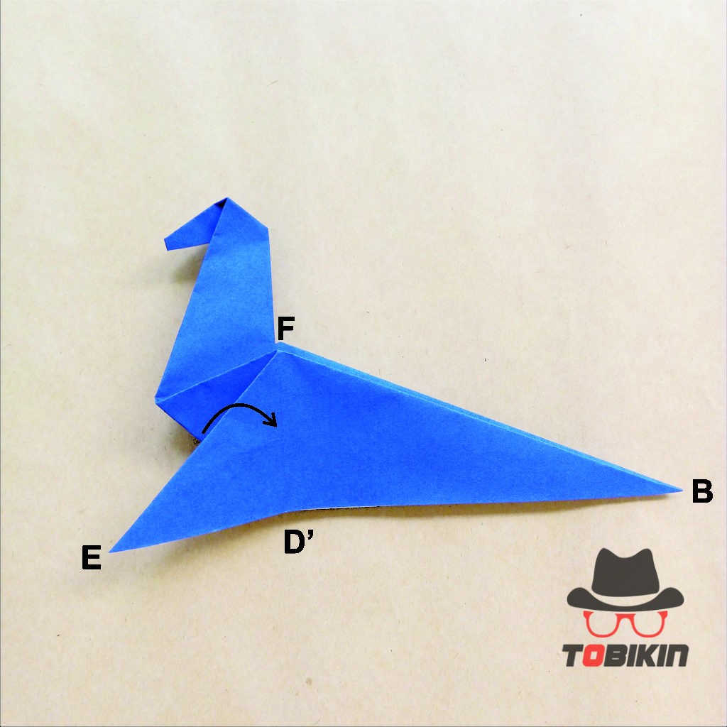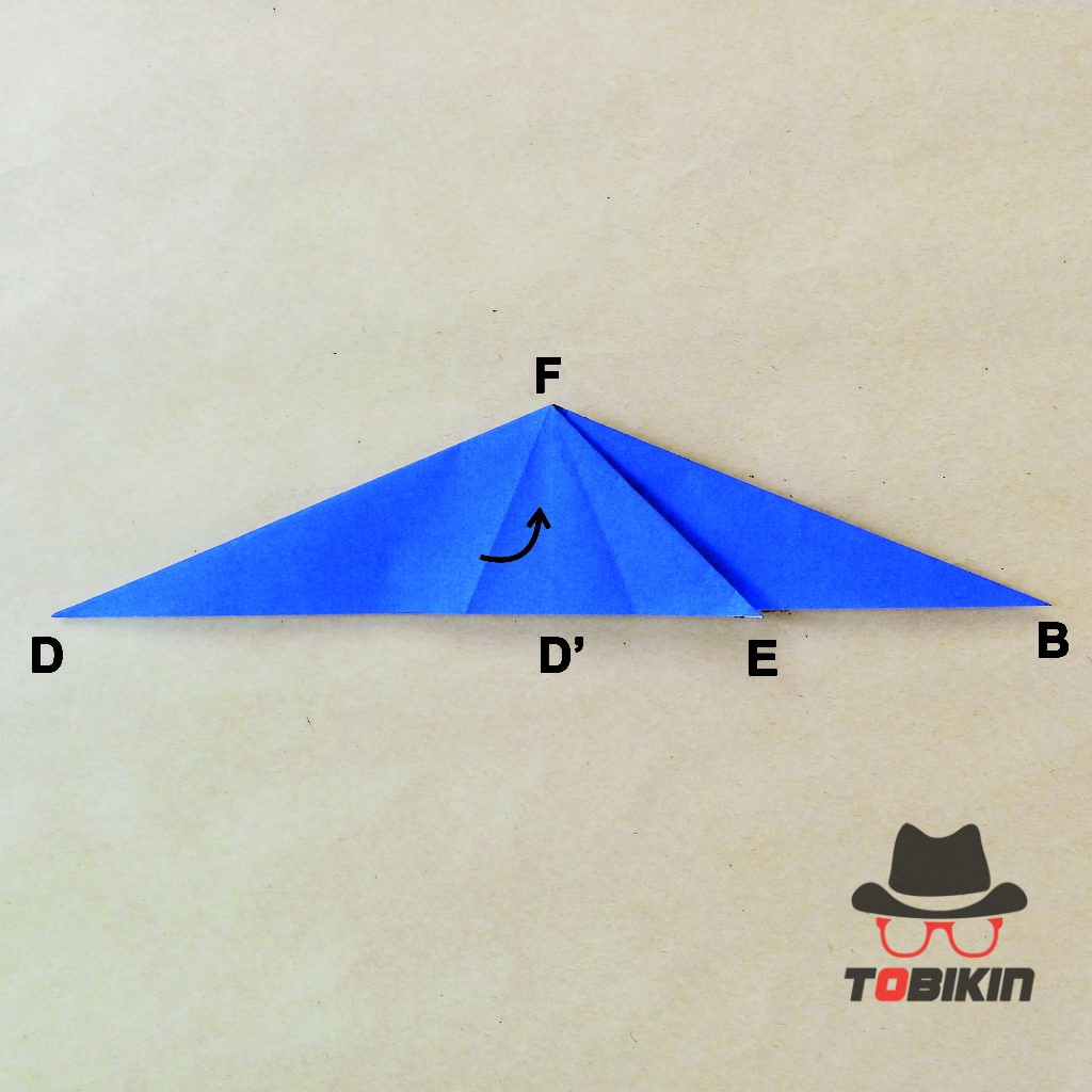 Untuk membuat leher dan kepala, tarik D lalu lipat hingga selurus dengan D’F lalu buka kembali. Akan muncul garis miring bekas lipatan di titik D’