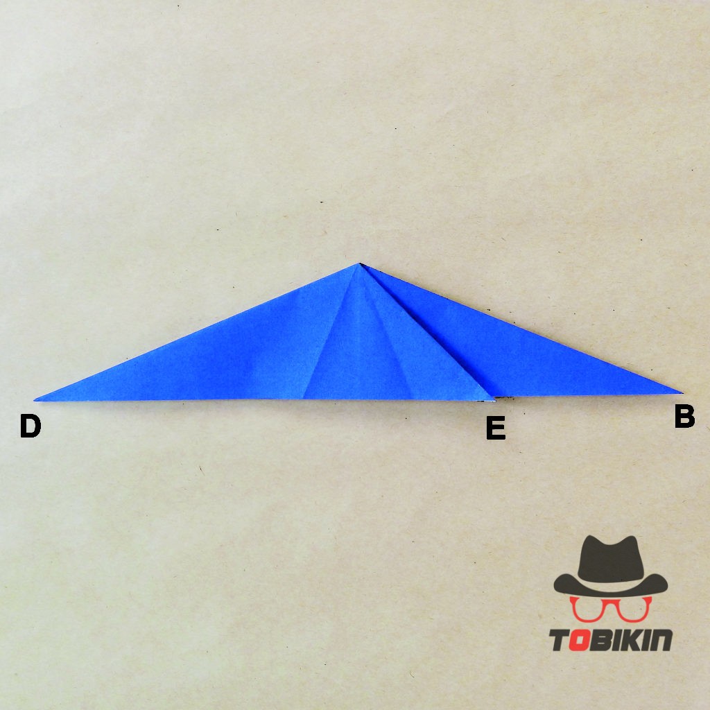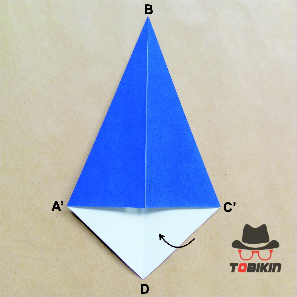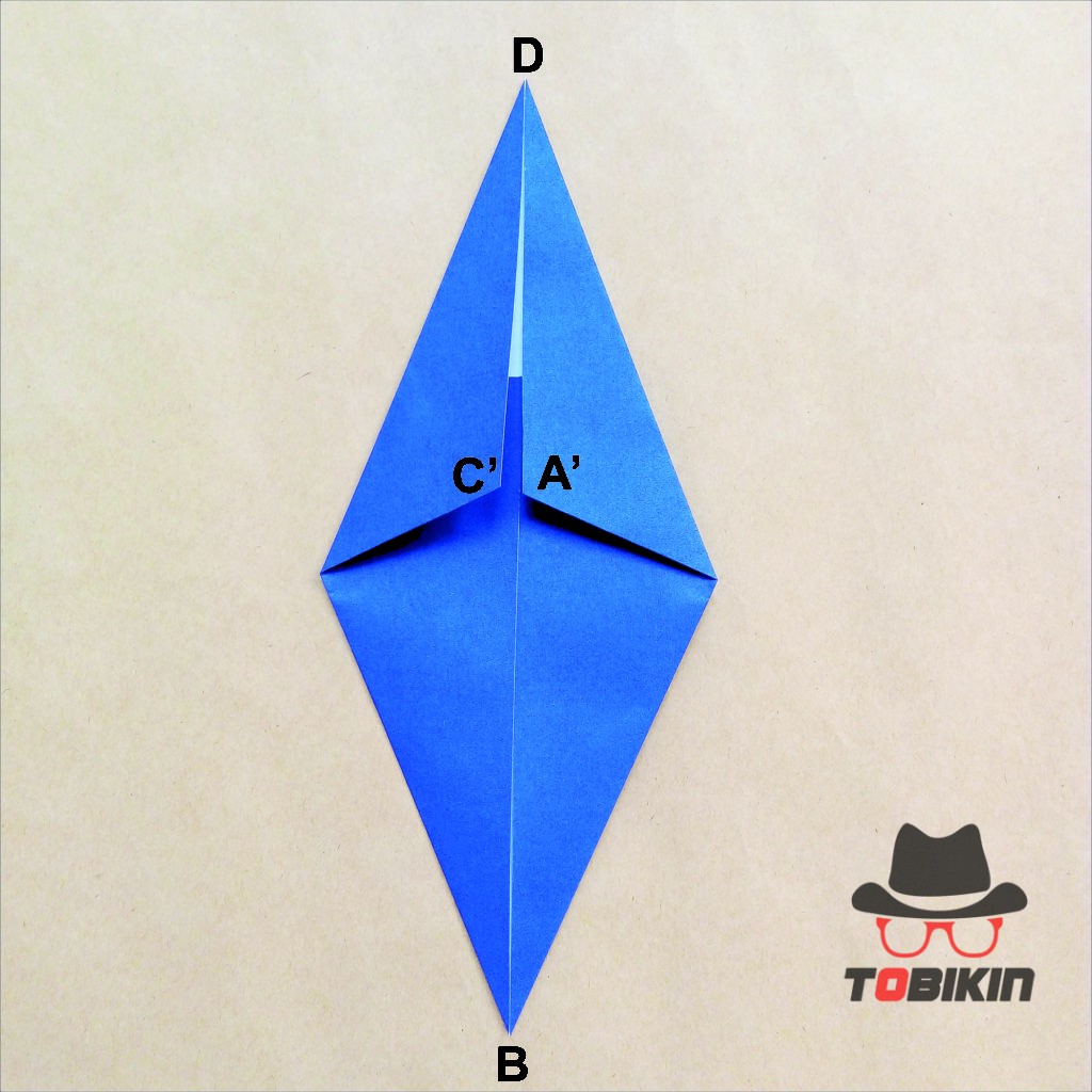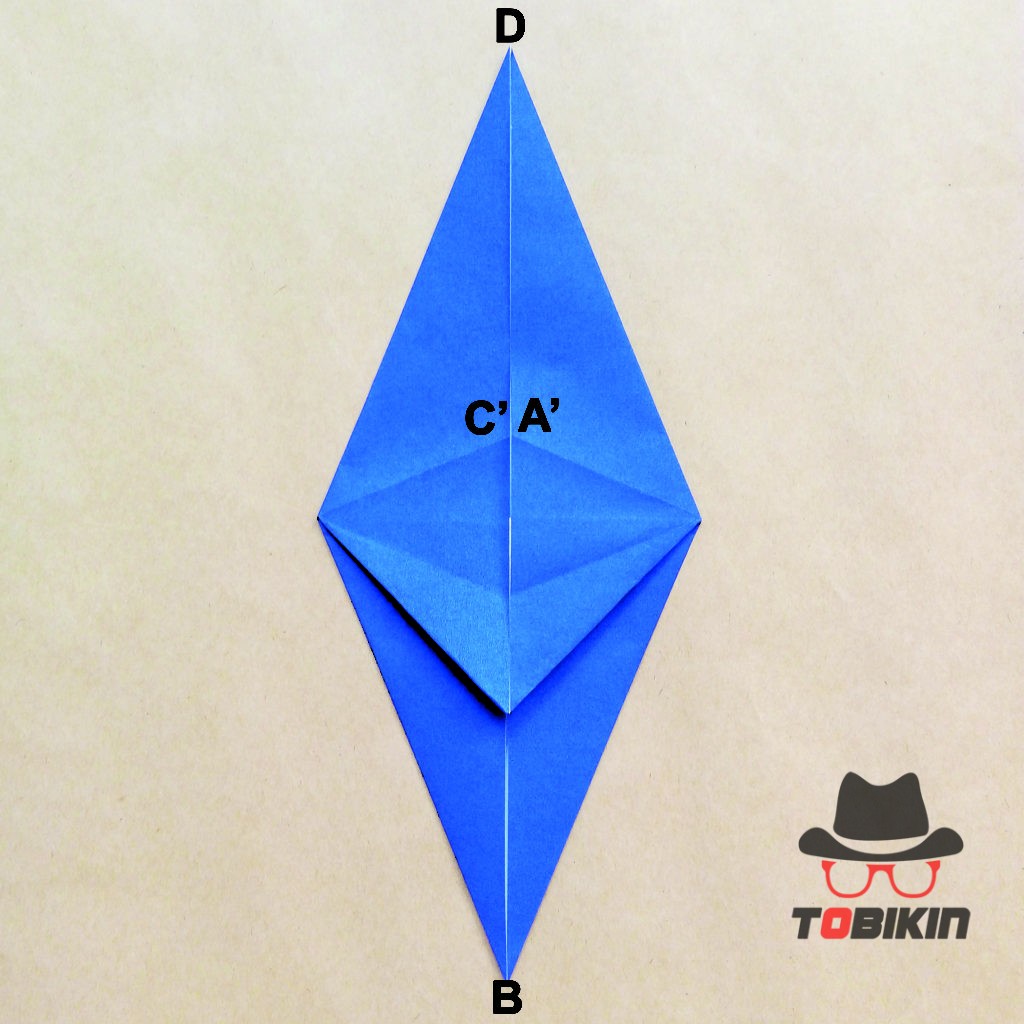 Untuk membuat leher dan kepala, tarik D lalu lipat hingga selurus dengan D’F lalu buka kembali. Akan muncul garis miring bekas lipatan di titik D’