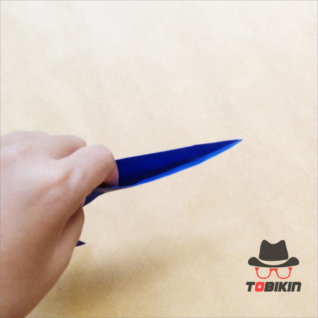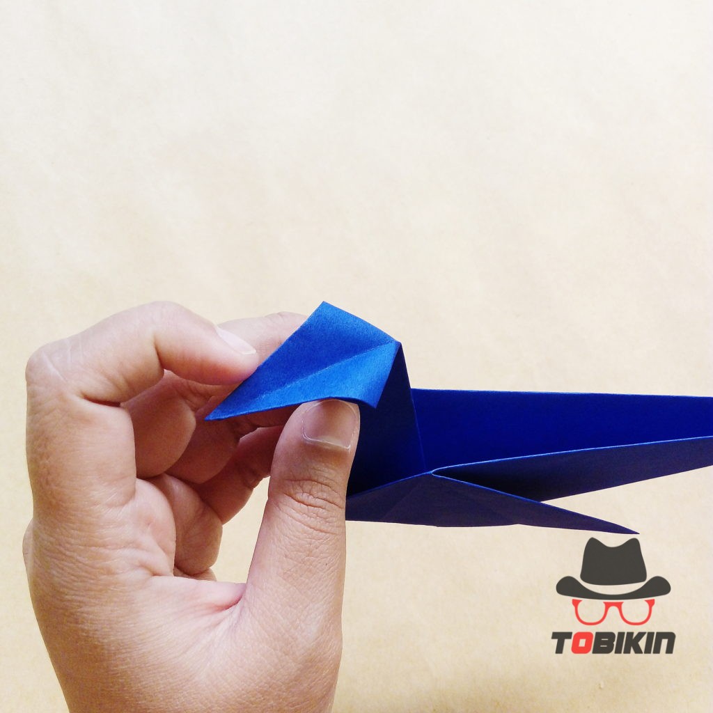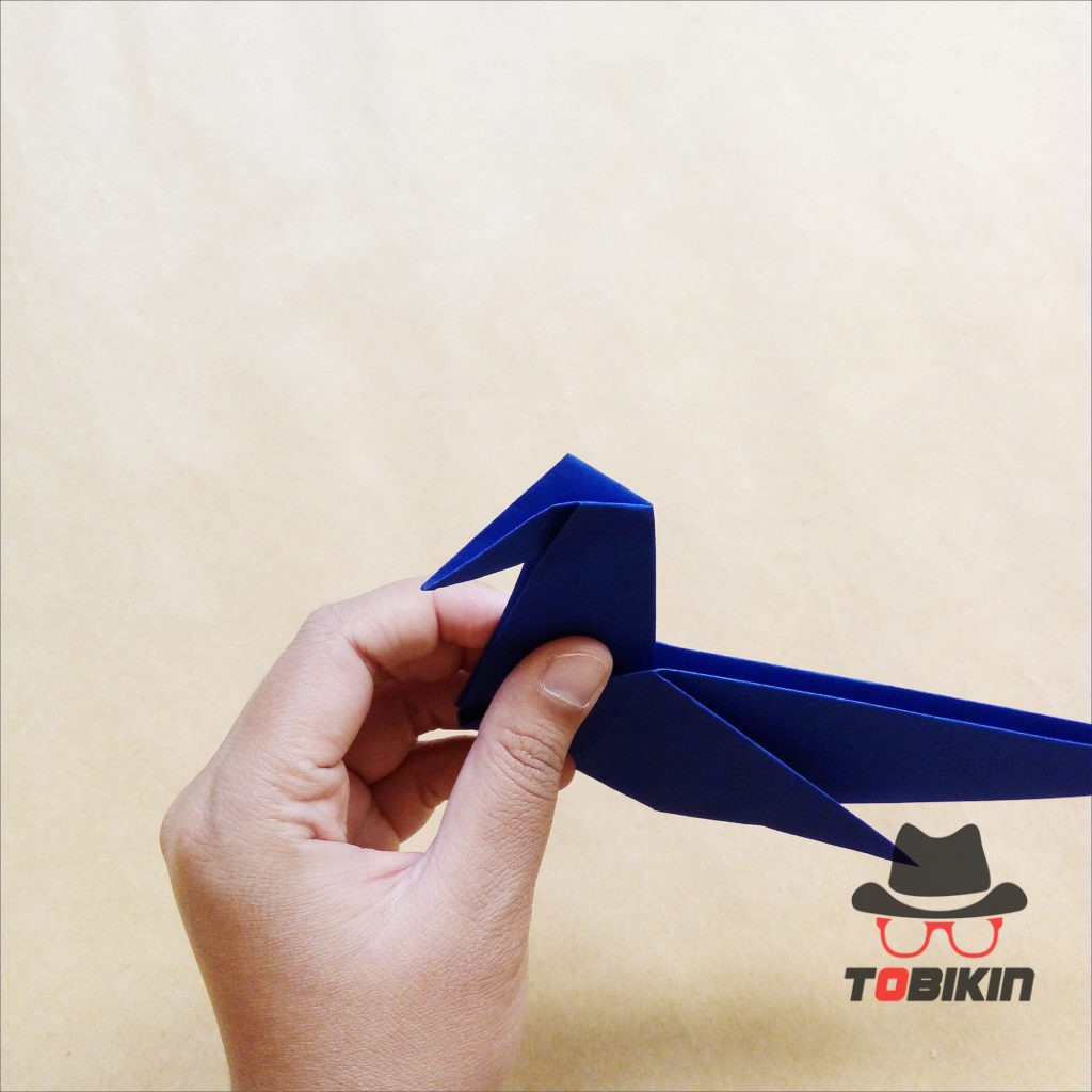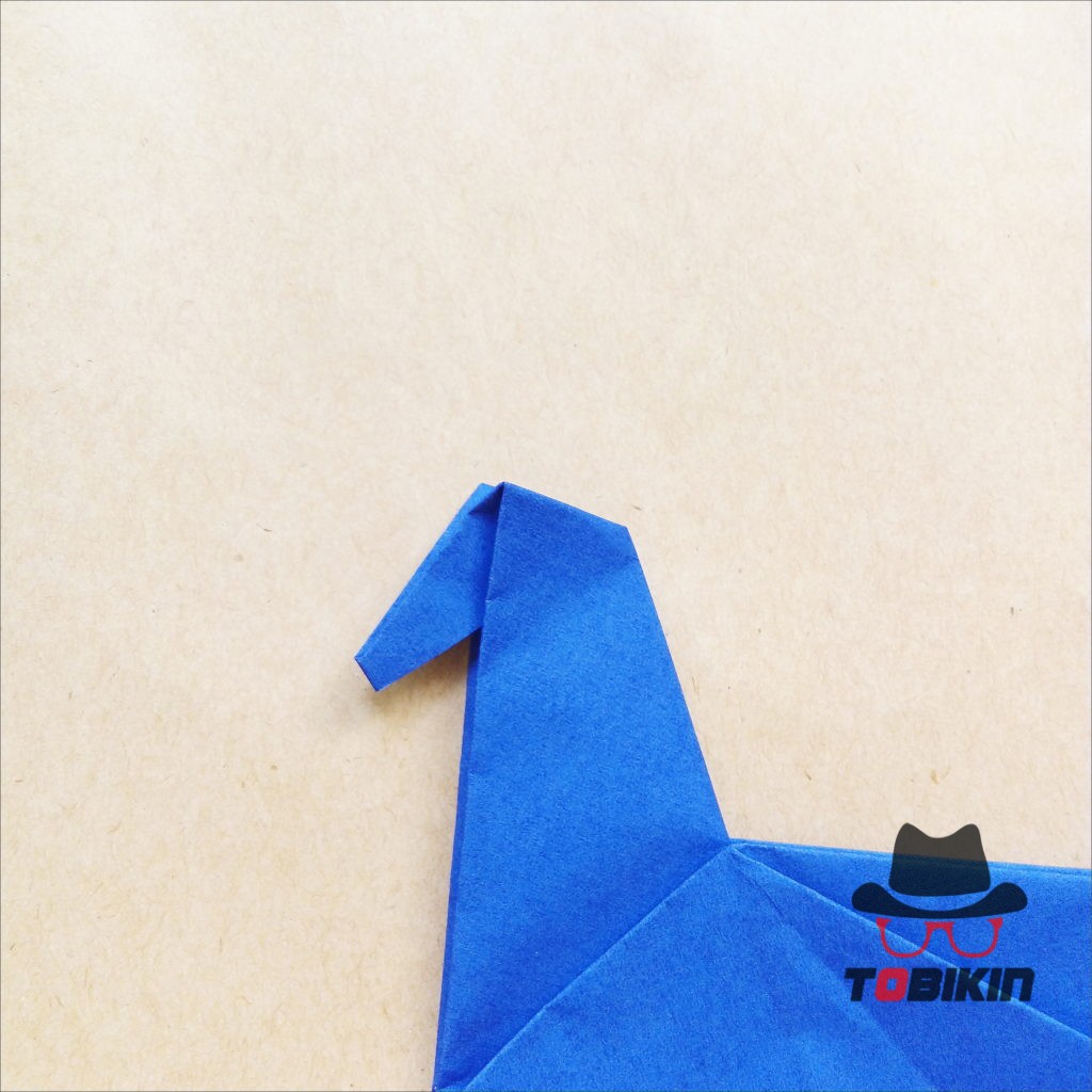 Buka bagian yang akan dijadikan leher lalu lipat kedalam seperti gambar di bawah ini dan jadilah leher kuda. (Tahap sampai pembuatan kepala mirip saat membuat origami bangau)