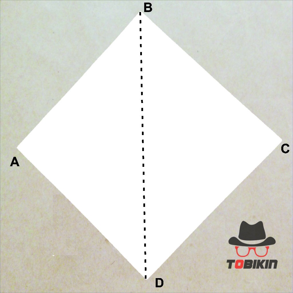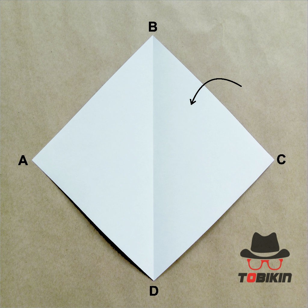 Buat garis lipatan diagonal hingga titik A bertemu titik C, buka kembali. Lipat BC hingga berada di garis BD, lakukan pada sisi satunya.