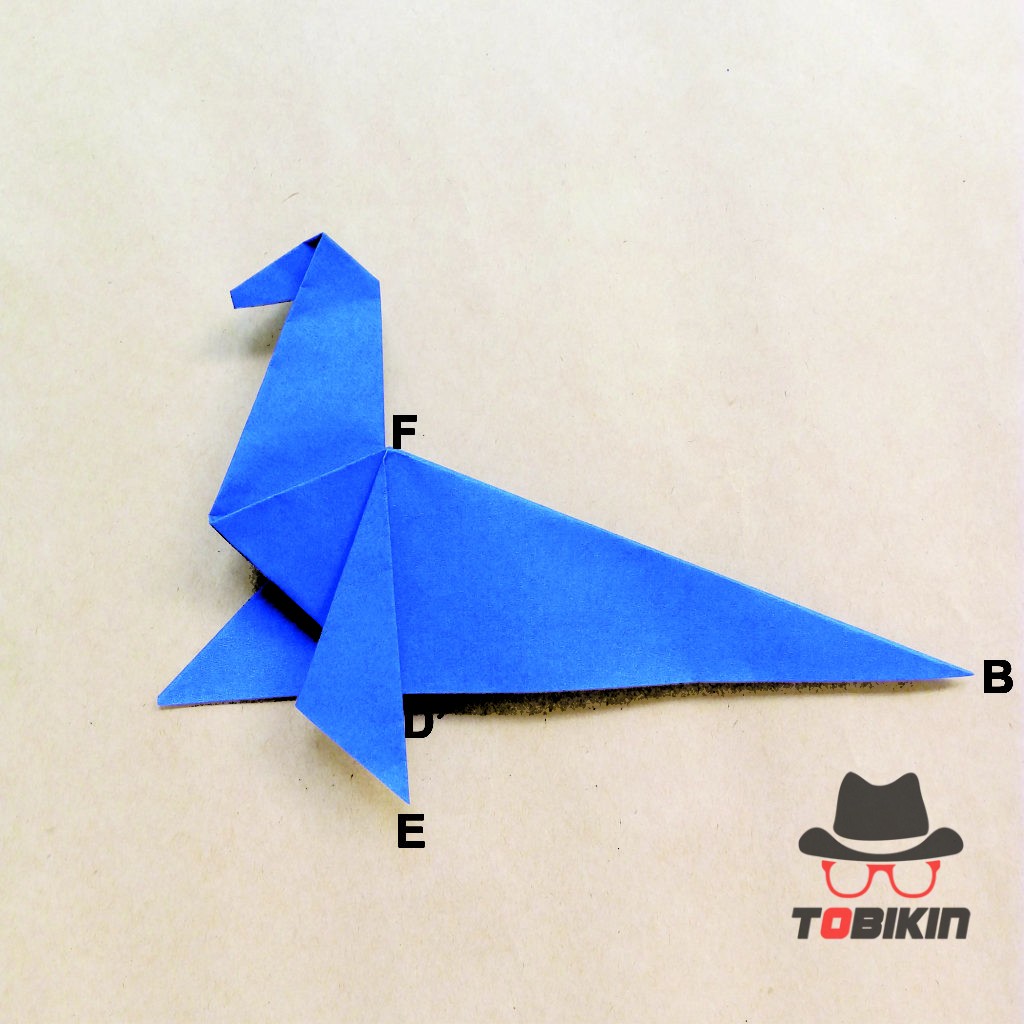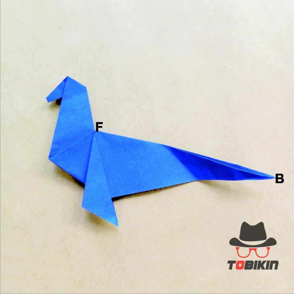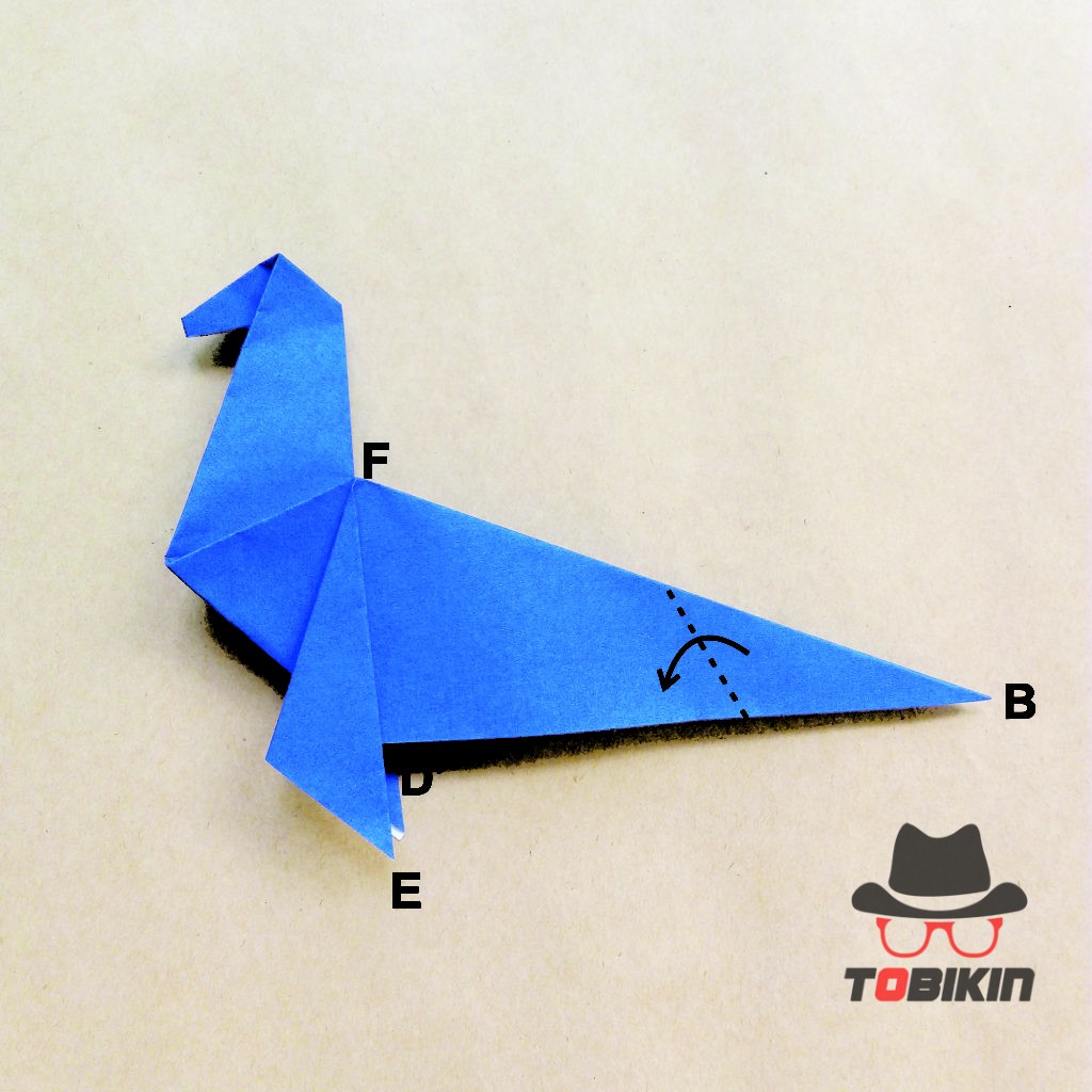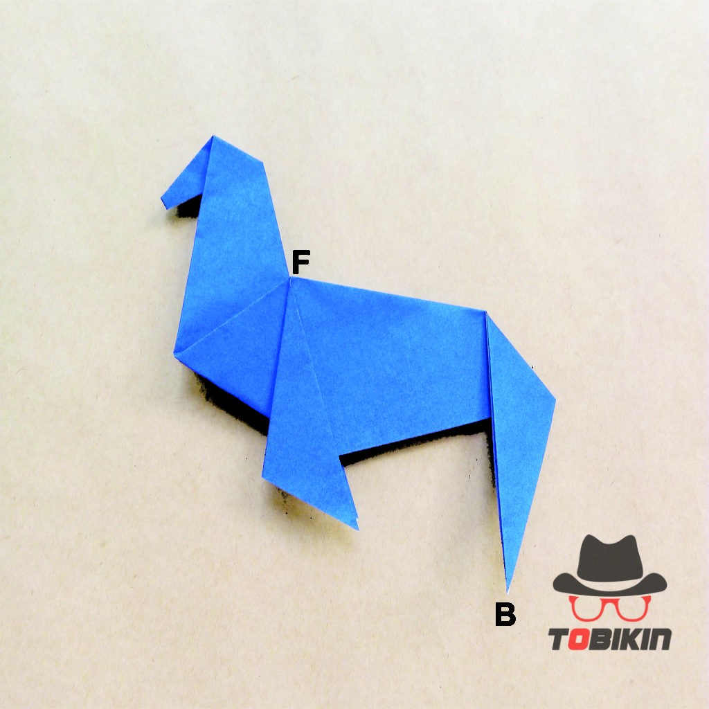 Untuk membuat kaki belakang kuda, lipat B sejajar dengan kaki depan seperti gambar dibawah lalu buka kembali dan akan muncul garis miring bekas lipatan. Masukan telunjuk tangan kiri di dekat bekas lipatan lalu tangan kanan menarik titik B kebawah seperti gambar dibawah. Lipat ujung kaki kedalam.