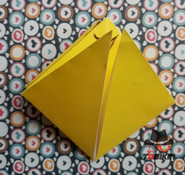 Buka semua lipatan kembali. Gambar wajah pikachu dengan spidol sesuai letaknya di sekitar pertemuan diagonal. Lipat 2 memanjang. Lipat membentuk segitiga dengan garis pada bagian mulut sebagai acuan. Lipat segitiga juga bagian belakangnya.