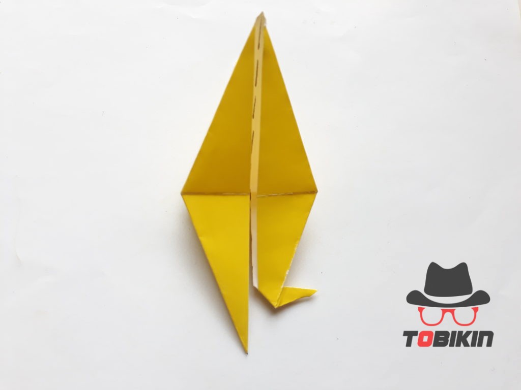 Balik segitiga kecil yang baru terbentuk ke arah dalam.Lipatan ini akan menghasilkan belah ketupat panjang dengan satu ujung terbuka.
