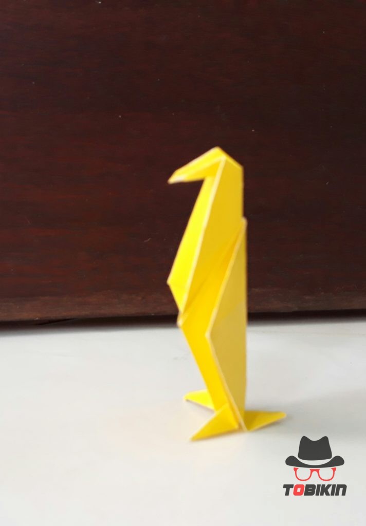 Lipat menurut diagonal panjang. Bentuk kepala pinguin seperti melipat kaki tapi agak menunduk. Berdirikan pinguin. Lipat ujung ekor ke arah belakang dan sesuaikan besar lipatan agar pinguin bisa tegak berdiri.