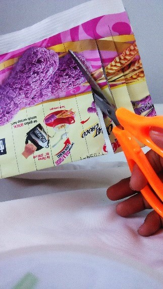 Untuk pemberian tekstur lebih cantik dan indah, dilapisi dengan bungkus makanan yang sudah dibuang. Contohnya bungkus oat rasa ubi ungu.