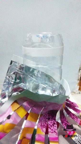 Kemudian, diberikan double tape pada ujung atas dan bawah botol secara melingkar. Setelah dilepas, salah satu ujung bungkus plastik ditempelkan dengan ujung atas botol. Dan ujung bungkus lainnya ditempelkan dengan ujung bawah botol.